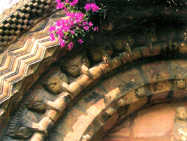 Los motivos de zigzag y ajedrezados, junto a la distribución en el conjunto, delatan el espíritu normando de los canteros que tallaron esta portada.